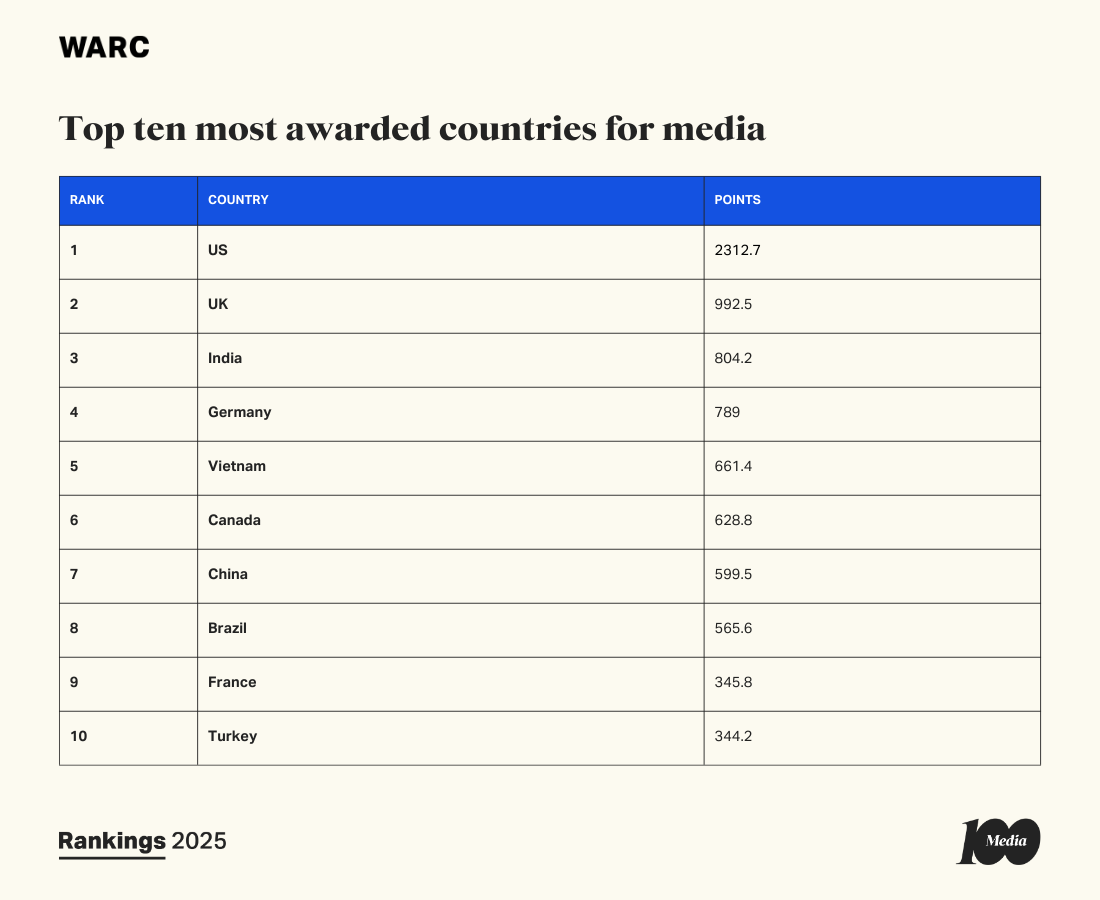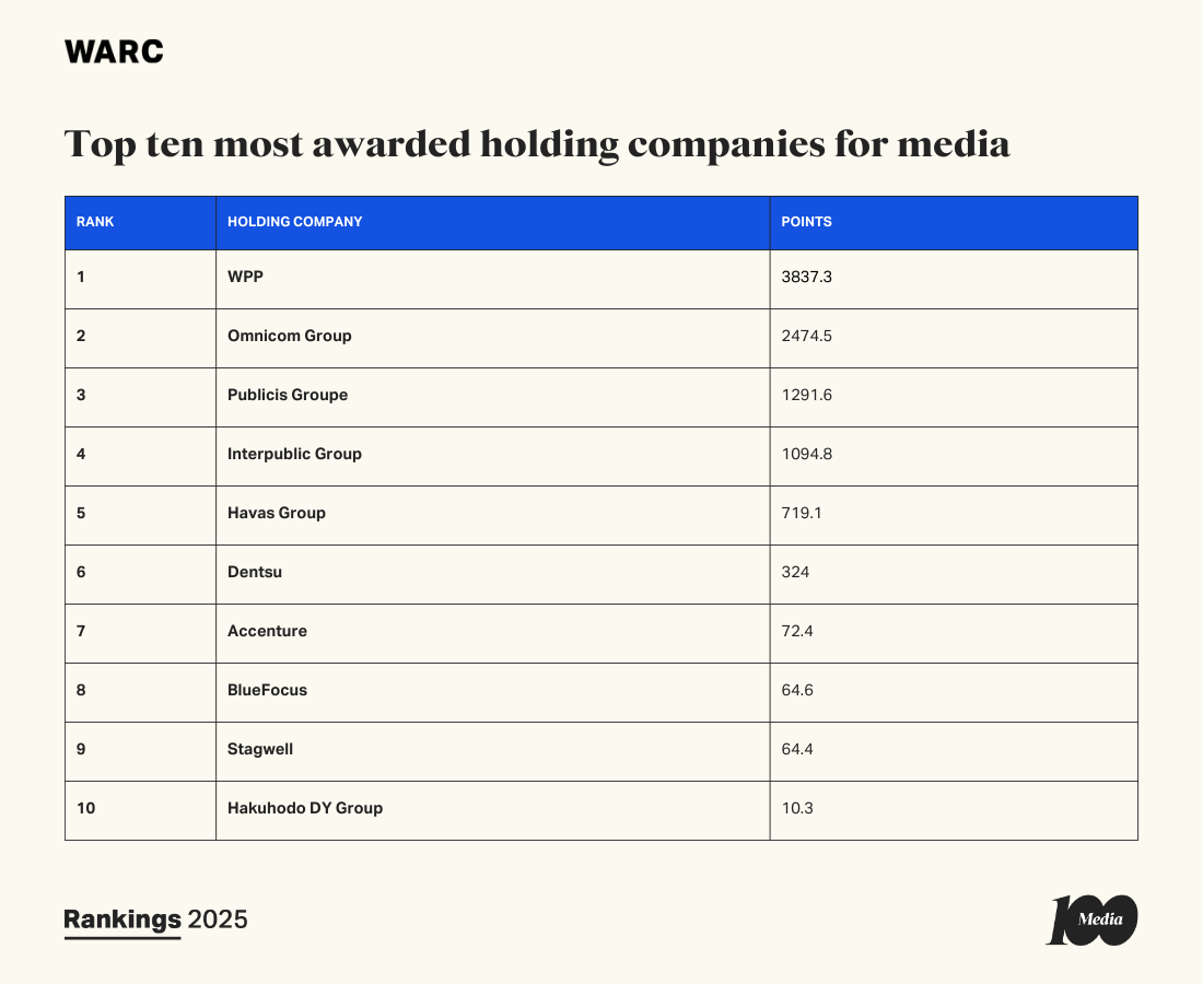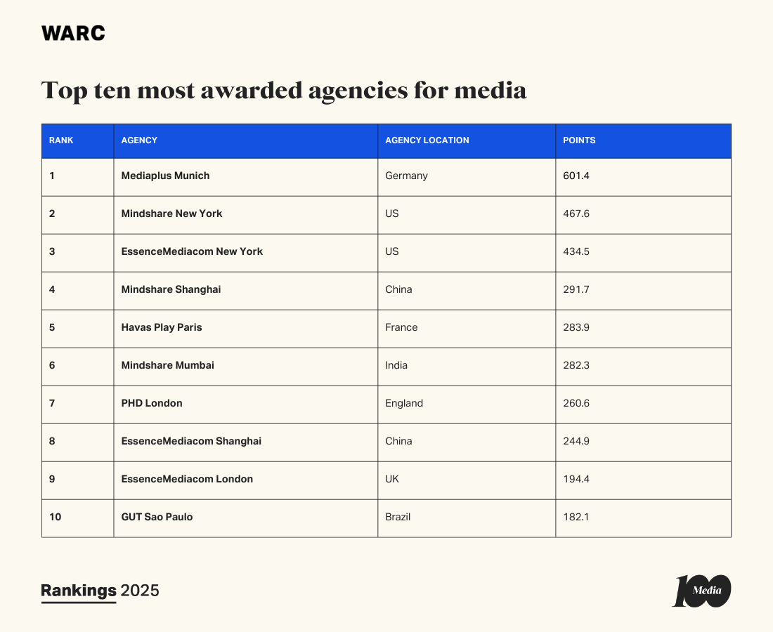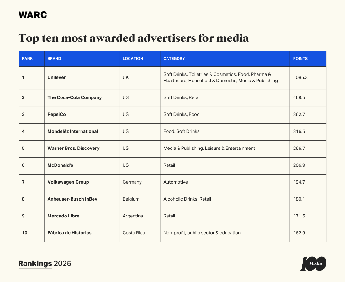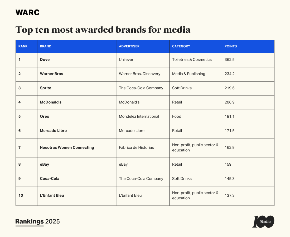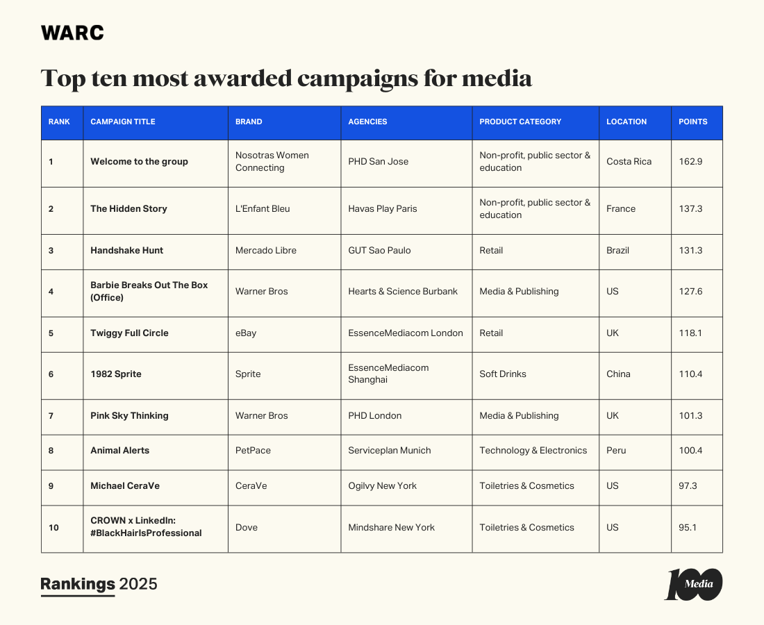 De top-10 hoogst gerangschikte campagnes en bedrijven in de Warc Rankings Media 100 2025: