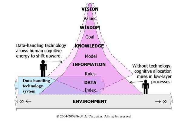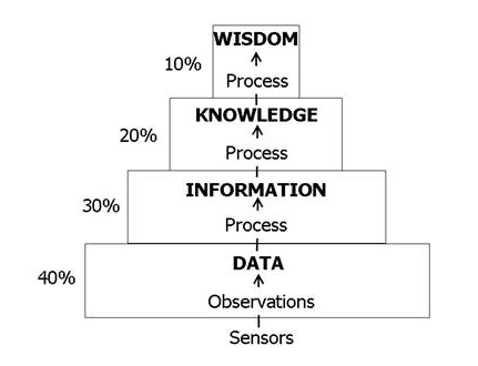 Om te beginnen, de cognitieve mogelijkheden van een mens lijken beperkt te zijn. Professor Ackoff stelt dat 40% van alle cognitieve processen in de hersenen zijn gericht op het verwerken van data: dit zijn alle prikkels die in de hersenen binnenkomen. Zo’n 30% van de overgebleven cognitieve energie gaat vervolgens op aan het verwerken van de informatie en 20% aan het vormen van kennis. Daardoor blijft er slechts 10% over voor de hogere lagen als wijsheid en visie.