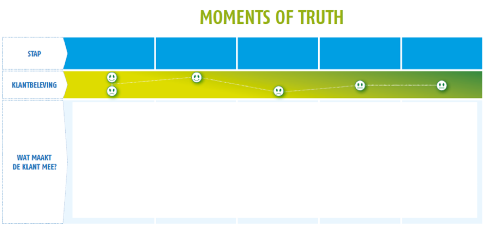 - Key moments of truth: dit zijn de momenten die er echt toe doen. Zo kan een contactmoment als heel slecht worden ervaren. Zo’n slechte ervaring kan de doorslag geven voor de klant om weg te lopen.