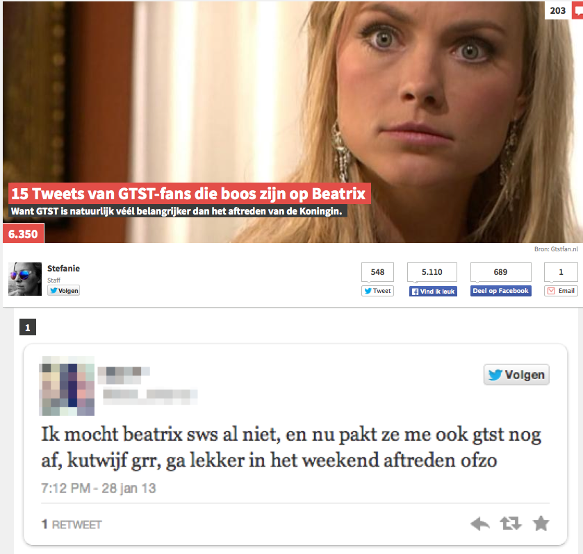 Zo werd onderstaande artikel bedacht toen duidelijk werd dat Beatrix ‘s avonds haar aftreden aankondigde. Als gevolg hiervan moest de uitzending van GTST op RTL4 wijken. Als invalshoek werd gekozen voor de boze reacties van GTST-fans. Het item werd in no time duizenden keren gedeeld. Awesome en snackable. Nu terug naar KLM.