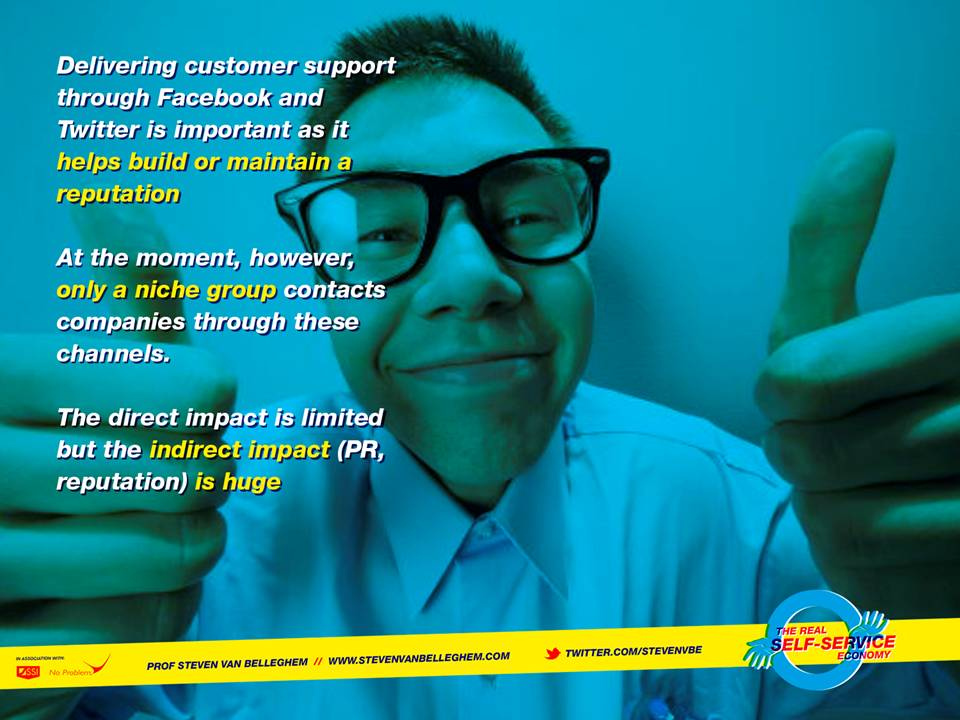Mijn buikgevoel zegt dat hypothese 1 een belangrijke is. Over heel de wereld zijn de feiten dezelfde. Een heel kleine groep verkiest sociale media als kanaal, een heel grote groep verkiest self service. Als bedrijf zou ik trouwens hopen dat de trend in die richting gaat. Self service biedt immers gigantisch veel efficiëntie voordelen, die vragen beantwoorden via sociale media niet hebben.