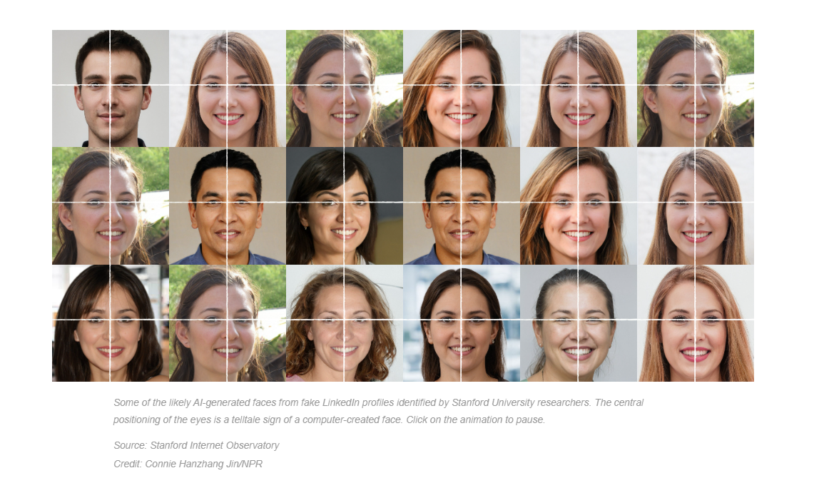 Het kan ook een van de nieuwste LinkedIn-marketingtactieken zijn: AI-gegenereerde gezichten gebruiken om de verkoop te stimuleren…. Een middel dat gebruikt wordt om desinformatie te verspreiden is dus via Linkedin naar de bedrijfswereld gekomen. Stanford’s @noUpside & @JoshAGoldstein vonden meer dan duizend profielen met schijnbaar valse gezichten. Een impressie zie je in de foto hierionder.