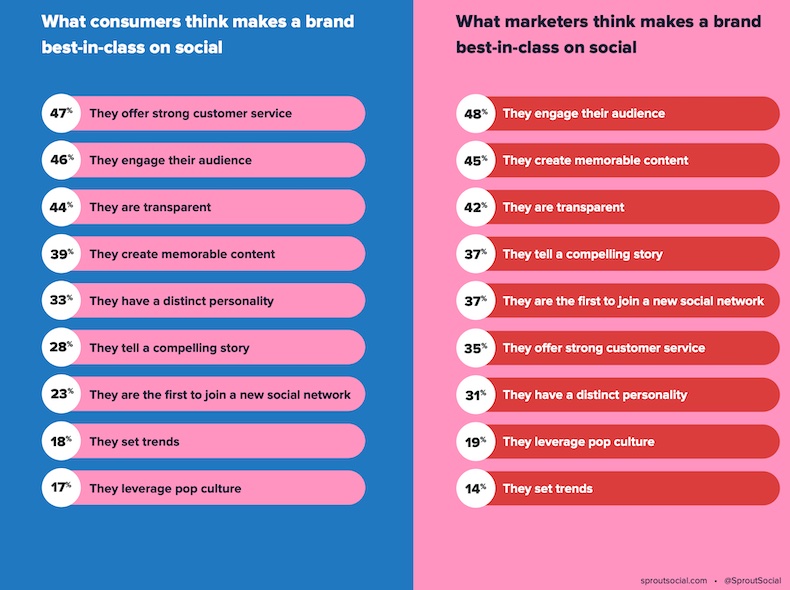 Volgens recent onderzoek van Sprout Social verschillen marketeers en consumenten van elkaar in wat zij denken dat een merk ‘best-in-class’ maakt op sociale media. Het rapport was gebaseerd op gegevens van een onderzoek dat tussen 30 maart en 6 april 2021 is uitgevoerd onder 1.002 Amerikanen en 1.001 Amerikaanse marketeers. Dat verschil zit ‘m vooral in de intentie waarmee merken aanwezig zijn. Marketeers beschouwen ‘engaging audiences’ als het belangrijkste dat een merk tot uitblinker maakt op sociale media. Consumenten beschouwen het aanbieden van goede klantenservice als het belangrijkste dat een merk tot ‘de beste in zijn klasse’ maakt op social. Open deur, maar begin er maar eens over.
