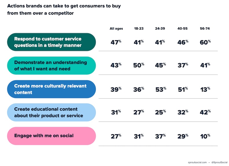 Marketingprofs pikte het Sprout-onderzoek deze week op en wijst er dus op dat consumenten zeggen dat het bieden van goede klantenservice, met name het tijdig beantwoorden van vragen, de belangrijkste actie is die een merk kan nemen om ervoor te zorgen dat ze dat merk verkiezen boven een concurrent. Voor het overige valt op dat er in het algemeen ook veel overeenstemming is tussen wat consumenten vinden en wat marketeers denken, al is er dan wel weer een flink verschil tussen het belang dat wordt gelegd op ‘de eerste zijn’. Dat interesseert de social media-gebruiker kennelijk een stuk minder dan marketeers, die – begrijpelijk – verder niet zo bewust bezig zijn met de concurrentie. De onderzoekers focussten vervolgens op die vraag: Wat maakt dat een merk het béter doet? En dat ook nog uitgesplitst naar leeftijd.