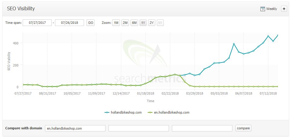 Omdat de Nederlandse variant, het hoofddomein (hollandbikeshop.com), veruit de hoogste autoriteit heeft, werd besloten om de landen te migreren van subdomeinen naar subfolders, om de overige landen ook te laten profiteren van de autoriteit die de Nederlandse website heeft opgebouwd.