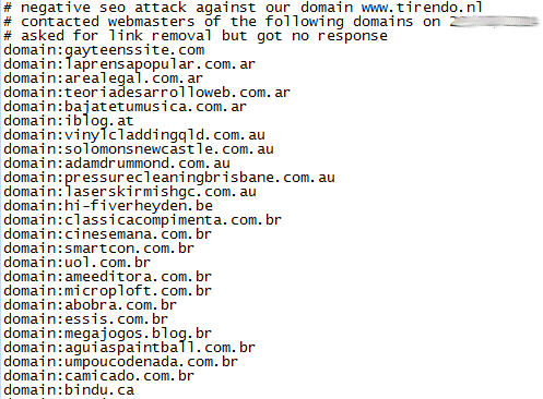 Nu moet ik wel zeggen dat in de meeste gevallen, zoals ook in het onze, er niets anders opzat dan de links overzichtelijk te verzamelen en het tekstbestand via de Disavow Tool te uploaden. Google biedt je de mogelijkheid om niet alleen links, maar ook hele domeinen af te wijzen. Dit is bijzonder praktisch wanneer een groot deel van de spam van één bepaalde website komt.
