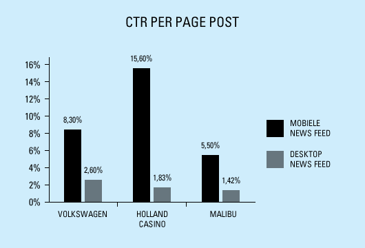 In het staafdiagram rechts is duidelijk te zien dat de CTR zowel bij Volkswagen, Holland Casino als Malibu aanzienlijk hoger ligt bij posts gepromoot via de mobiele news feed. Holland Casino schiet er bovenuit met 15,6% CTR.