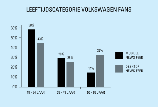 Om dit te onderzoeken hebben we voor Malibu, Holland Casino en Volkswagen twee soorten campagnes via de news feed gedaan, een campagne om meer engagement te genereren op posts en een campagne om fans te werven. Bij het opzetten van deze campagnes zijn de budgeten in tweeën verdeeld. De ene helft is ingezet op de mobiele news feed-campagne en de andere helft is ingezet op de desktop news feed-campagne. Daarnaast is er een onderverdeling gemaakt in mannen en vrouwen met een leeftijd tussen de 18-34 jaar, 35-49 jaar en 50-65 jaar.
