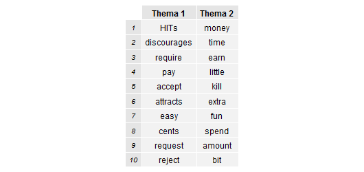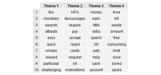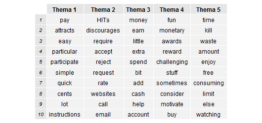 In de tabel is te zien hoe het eerdere thema ‘Wat maakt een taak aantrekkelijk?’ (Thema 1 uit de oplossing met vier thema’s) nu is opgesplitst. Dit specifieke thema wordt nu uitgediept aan de hand van twee subthema’s. Het eerste subthema (Thema 1 in bovenstaande tabel) gaat over ‘Hoe aantrekkelijkheid afhangt van de lengte en eenvoud van een taak, en bovendien van de redelijkheid van de uitbetaling’ (“I usually pick tasks that are short, easy to finish, and pay at least .02 to .03 cents”). Het twee subthema (Thema 4 in dezelfde tabel) heeft betrekking op ‘Hoe de aantrekkelijkheid van een taak afhangt van een beloning, zoals geld, plezier of de uitdaging’ (“The reason for completing tasks is purely for the monetary awards but there is a fun aspect to it as well”).