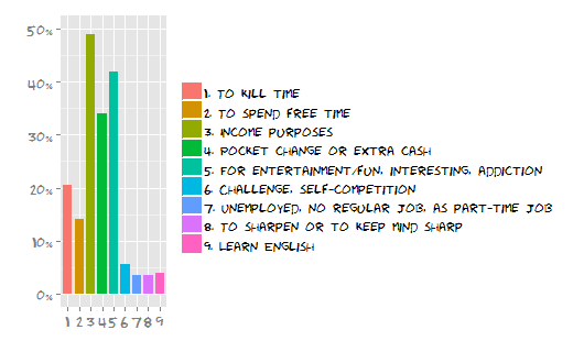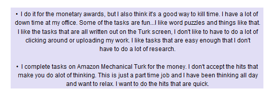 Deze categorisatie bracht Ipeirotis tot de conclusie dat Turkers deelnemen aan HITs “[…] to get some extra cash and pay for gas, but there is a significant fraction that does it for fun, because they consider Turking interesting, and sometimes even addicting!”