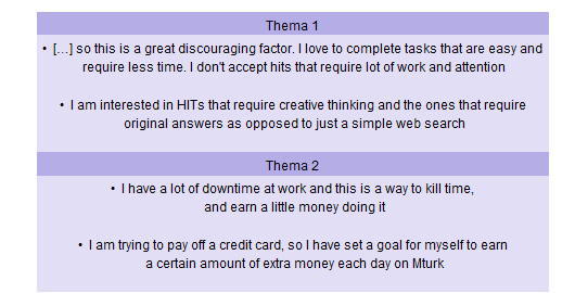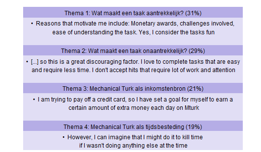 De combinatie van themawoorden en representatieve tekstfragmenten maakt op haar beurt het duiden van de twee thema’s mogelijk. Het eerste thema lijkt betrekking te hebben op ‘de eigenschappen van HITs’. Hieronder valt bijvoorbeeld wat een taak aantrekkelijk óf juist onaantrekkelijk maakt voor een Turker. Het tweede thema lijkt meer te gaan over ‘wat levert deelname aan Mechanical Turk op voor de Turker, of anders gezegd, wat heeft de Turker aan deze deelname?’. Bij het tweede thema gaat het dus meer over de extrinsieke waarde van een taak.