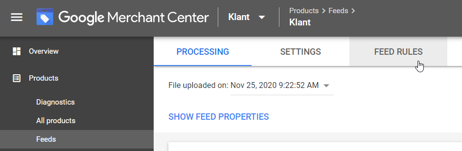 Navigeer in het hoofdmenu van het Google Merchant Center naar Product > Feed en vervolgens naar Feedrules.