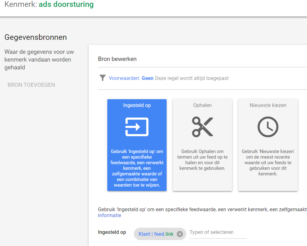 Creëer vervolgens een nieuwe feed-regel met het kenmerk ‘link’ en voeg de van UTM-tags voorziene url toe als vrije invoer. Met deze regel zorg je dat gratis shopping verkeer binnenkomt in Google Analytics met UTM tags, en ze dus te onderscheiden zijn van het andere verkeer.