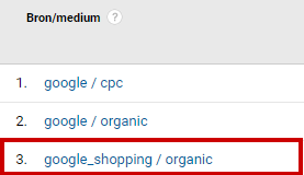 Vanaf het moment dat de free product listings bezoekers binnengehaald hebben, wordt dit zichtbaar binnen in Google Analytics. Dit kan gevonden worden onder Acquisitie > Source / Medium > google_shopping / organic