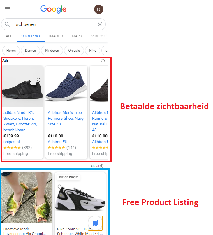 Free product listings zijn gratis weergaven van jouw producten binnen de Google Shopping-tab, op basis van jouw feed. Deze gratis weergaven vinden plaats op de ‘Platforms van Google’, dus binnen Google Search, Google Images en Google Shopping. Per zoekopdracht wordt er bepaald of er free listings worden weergegeven. Als ze worden uitgeleverd, zijn ze zichtbaar onder de betaalde weergaven, onder ‘about’ zoals onderstaande afbeelding weergeeft.