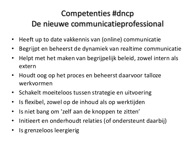 De nieuwe communicatieprofessional zou volgens Renate Verloop en Marije van den Berg aan de volgende eisen moeten voldoen om nog enigszins goed uit de verf te komen in de toekomst.