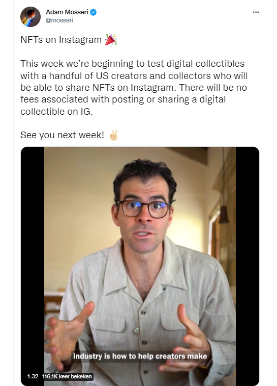 NFT-verkopen vlakken af – “De verkoop van nonfungible tokens (NFT’s) daalde deze week tot een dagelijks gemiddelde van ongeveer 19.000, een daling van 92% ten opzichte van een piek van ongeveer 225.000 in september. […] Het aantal actieve wallets op de NFT-markt daalde vorige week met 88% tot ongeveer 14.000 van een hoogtepunt van 119.000 in november. […] Veel NFT-eigenaren ontdekken dat hun investeringen aanzienlijk minder waard zijn dan toen ze ze kochten.” Is dit het begin van het einde zoals cryptojournalist Paul Vigna zich afvraagt in zijn artikel voor The Wall Street Journal? Of is dit simpelweg “de fase van teleurstellingen” waar de technologie volgens de hype-cycle van Gartner doorheen moet? Adam Mosseri, hoofd van Instagram, denkt er het zijne van. Hij neemt alvast een voorschot op de toekomst.