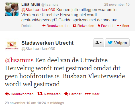 Webcare begint op de werkvloer, vertelt communicatieadviseur Peter-Paul Hellings. Sinds eind 2009 is er weliswaar een officieel Twitteraccount @GemeenteUtrecht, maar dat zet alleen nieuwsberichten door en reageert nooit ergens op. Met @Stadswerken030 en de hashtag #gladheid030 gaan Peter-Paul en een collega in november 2010 het Twitterpubliek informeren over de gemeentelijke gladheidsbestrijding. Vragen van burgers worden zo goed mogelijk beantwoord, soms vanaf de bank thuis of zelfs vanuit het buitenland. De reacties zijn positief.