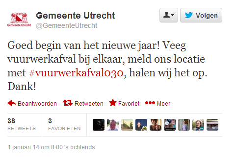 Succesverhalen zijn gelukkig ruimer voorhanden. Na de jaarwisseling 2012-2013 kreeg de gemeente de handen op elkaar voor een Twitteractie om vuurwerkafval snel en doelgericht op te ruimen. De bijhorende hashtag #vuurwerkafval030 schopte het tot een zevende plaats op de lijst van trending topics in Nederland. De afgelopen jaarwisseling werd de actie dan ook geprolongeerd: