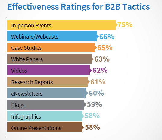 Webinars staan echter op de tweede plaats als je de gebruikte tactieken rangschikt op effectiviteit. Liefst 66 procent van de marketeers gelooft dat webinars effectief zijn. Social media komen daarentegen niet eens naar voren in deze top-10!