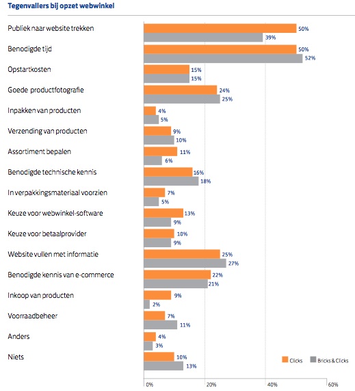 Ook bij Clicks zien we dit terug. De grootste tegenvallers zijn bij hen traffic (50%) en tijd (50%). Om een webwinkel op te zetten en te runnen dient een ondernemer serieus na te denken over een business plan (incl marketing strategie) en tijd die vrij moet worden gemaakt voor de webwinkel. Dit zal ten goede komen aan het proces, maar ook uiteindelijk het succes.