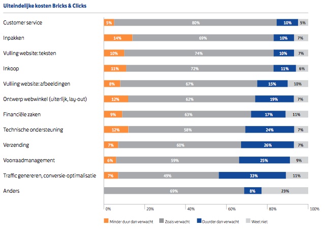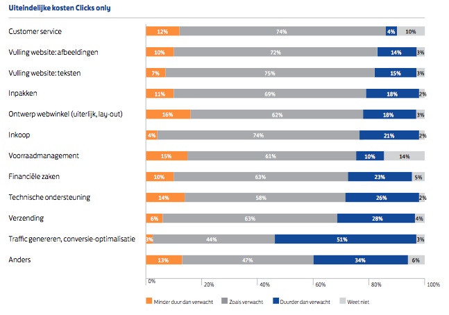 In het onderzoek heeft Intomart GFK onderzocht of de verwachte kosten van een webwinkel hoger of lager zijn uitgevallen voor de verschillende onderdelen van het opzetten en beheren van een webwinkel. Over het algemeen worden de kosten redelijk goed ingeschat. Alleen de kosten voor traffic worden in ruim eenderde van de gevallen niet goed ingeschat. Dit onderbouwt ook de grootste tegenvaller van een webwinkelier: traffic.