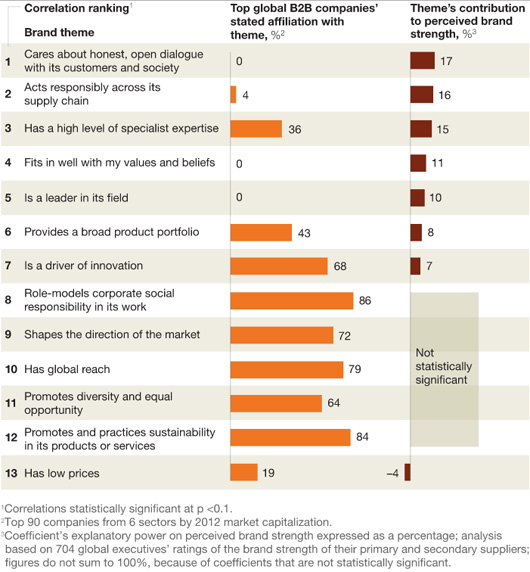 Marketeers van grote B2B-merken, daarentegen (in de linkerkolom), zoeken de kracht van hun merk nog in geheel andere dingen: duurzaamheid, marktleiderschap en corporate social responsibility, om er een paar te noemen. We zenden, kortom, over een golflengte waar de antenne van onze klanten helemaal niet op staat afgestemd. Misschien was dit wat Chris Martin jaren geleden al bedoelde toen hij zong: “They’re talking in a language I don’t speak.”