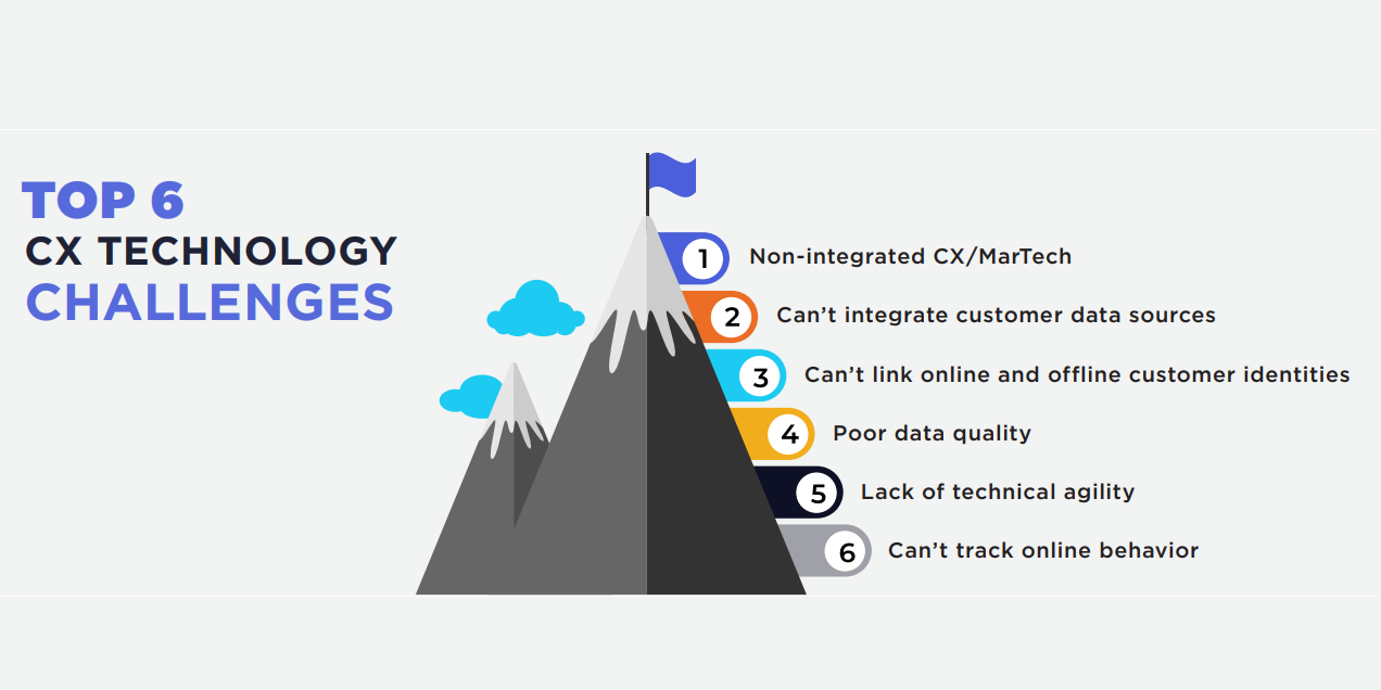 De CMO’s en marketingleiders zijn het erover eens dat een gebrek aan integratie het grootste obstakel is voor het gebruik van CX-technologie. Bedrijven ervaren daarin meerdere uitdagingen: zij worstelen met een onvermogen om databronnen samen te voegen (47%), ervaren problemen bij het werken met verschillende, niet op elkaar afgestemde marketing-oplossingen (44 %), of bij het samenvoegen van online en offline informatie tot een uniform klantprofiel (43%). Ook noemt 44% van de marketeers in EMEA de slechte datakwaliteit.