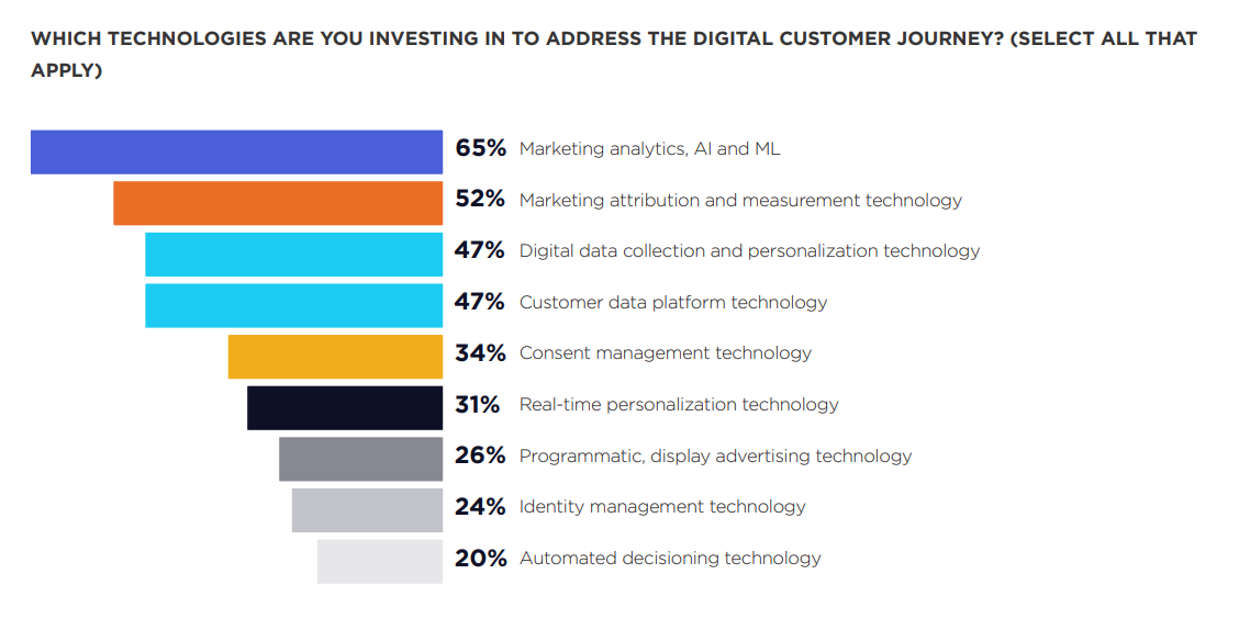 Tweederde van de marketingleiders in EMEA geeft aan overwegend te investeren in marketing analytics, AI en machine learning. Zij willen deze technologieën vooral inzetten om het gedrag en de behoeften van klanten te voorspellen. Daarnaast spelen marketingattributie en technologie voor het meten van succes een belangrijke rol volgens 55% van de EMEA-respondenten.