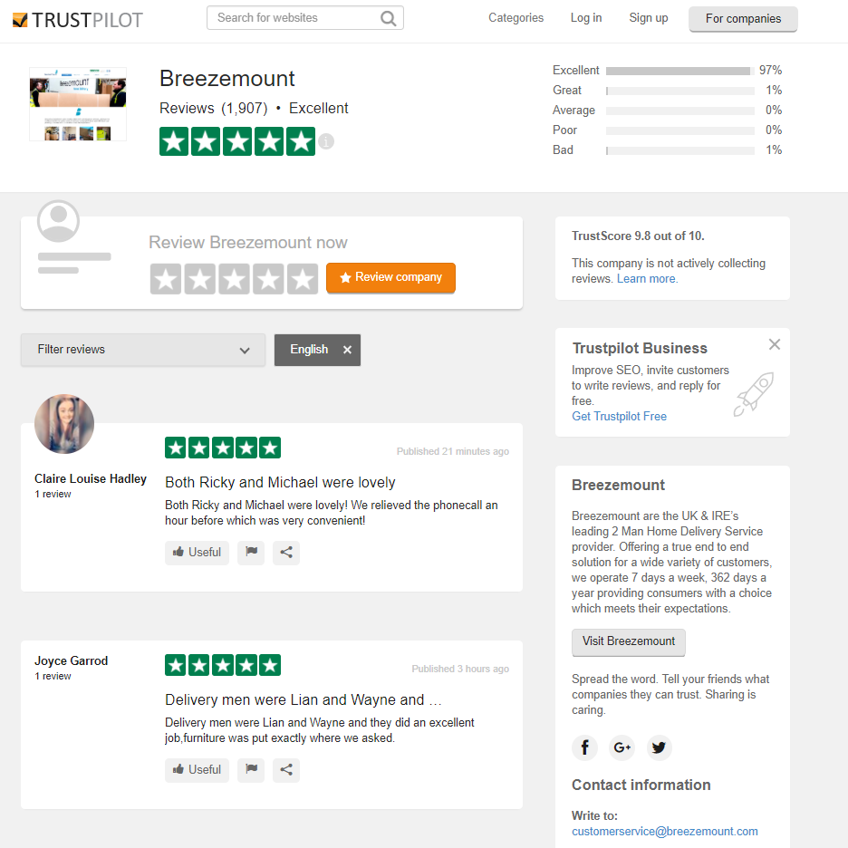 Platforms met reviews van derden, zoals Yelp, TripAdvisor en Trustpilot, wekken vertrouwen bij consumenten, omdat de mening van andere klanten niet door bedrijven kan worden bewerkt of verwijderd. Dit maakt elke beoordeling volkomen authentiek en daarom meer betrouwbaar en geloofwaardig. Een voorbeeld: op het Trustpilot-profiel van Breezemount kunnen shoppers de algehele score van het bedrijf, het aantal reviews en de gemiddelde beoordeling controleren.