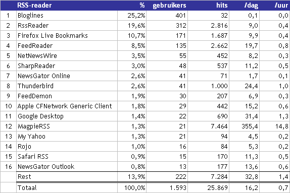 Vooralsnog is er weinig te merken van de specifieke Nederlandse RSS-portals zoals Feedo.nl. Bloglines, RssReader en Firefox Live Bookmarks zijn de favoriete RSS-readers voor de bezoekers van Marketingfacts. Daarmee wijken de cijfers voor Marketingfacts niet veel af van de internationale cijfers, met uitzondering van RssReader (dat blijkbaar in Nederland populairder is dan elders).