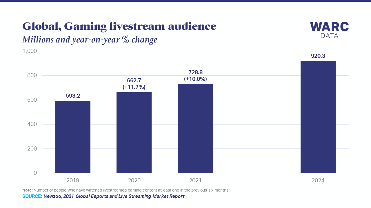 Aanvullend onderzoek van WARC Data wijst uit dat gamestreams vaak aantrekkelijker zijn geworden dan tv, althans voor jongere generaties, en dat Twitch alleen al sinds april 2020 elke maand meer dan twee miljoen kijkers trekt. Newzoo voegt daaraan toe dat driekwart van de inkomsten op professioneel e-sportsniveau afkomstig is van mediarechten en sponsoring, ruim 700 miljoen euro in 2021.