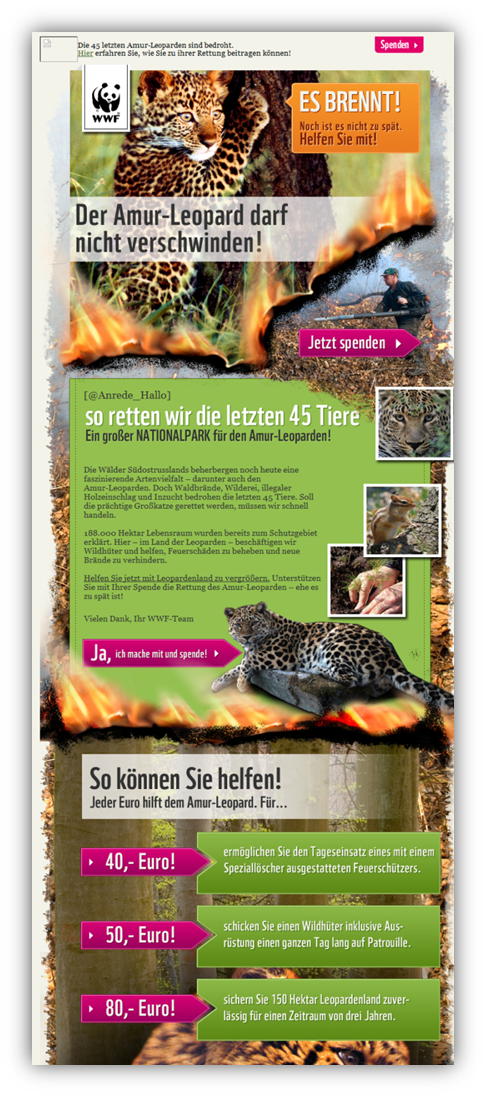 Het Duitse Wereld Natuur Fonds diende haar reguliere nieuwsbrief in. Het bureau achter de campagne, Rabbit eMarketing, koos voor een andere verzenddag, een meer visuele insteek van de nieuwsbrief, één hoofdboodschap in plaats van meerdere subonderwerpen en de urgentie om te doneren werd nadrukkelijker gecommuniceerd. Dat leverde een openingspercentage van 27 procent (was 20 procent) en een klikpercentage van 9,89 procent (was 5 procent) op. Niet echt imponerende cijfers voor (Nederlandse) e-mailmarketeers. De donatiecijfers waren dat wel.