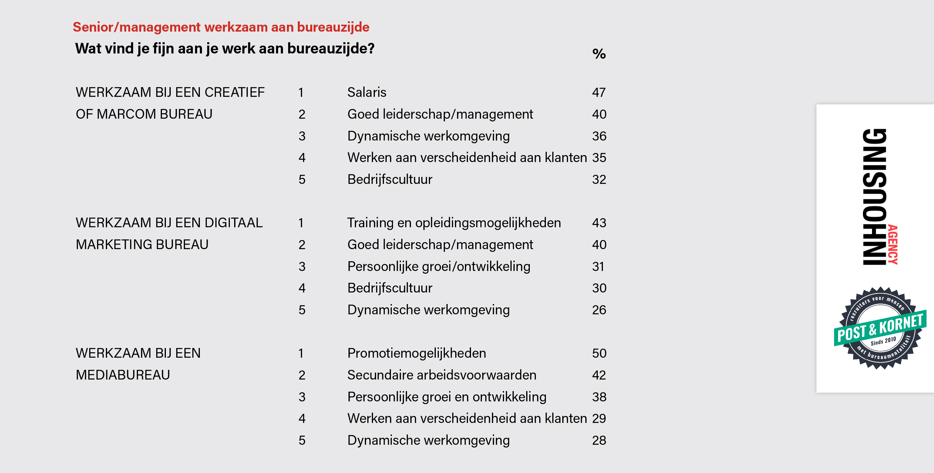 De senior en management groep, werkzaam bij creatieve bureaus, benoemt het salaris als belangrijkste pluspunt. Secundaire arbeidsvoorwaarden worden alleen benoemd door personen werkzaam bij mediabureaus. Datzelfde geldt voor promotiemogelijkheden die bij mediabureaus het meest worden gewaardeerd. De bedrijfscultuur wordt bij zowel media als creatieve bureau als fijn ervaren, maar staan een stuk lager.