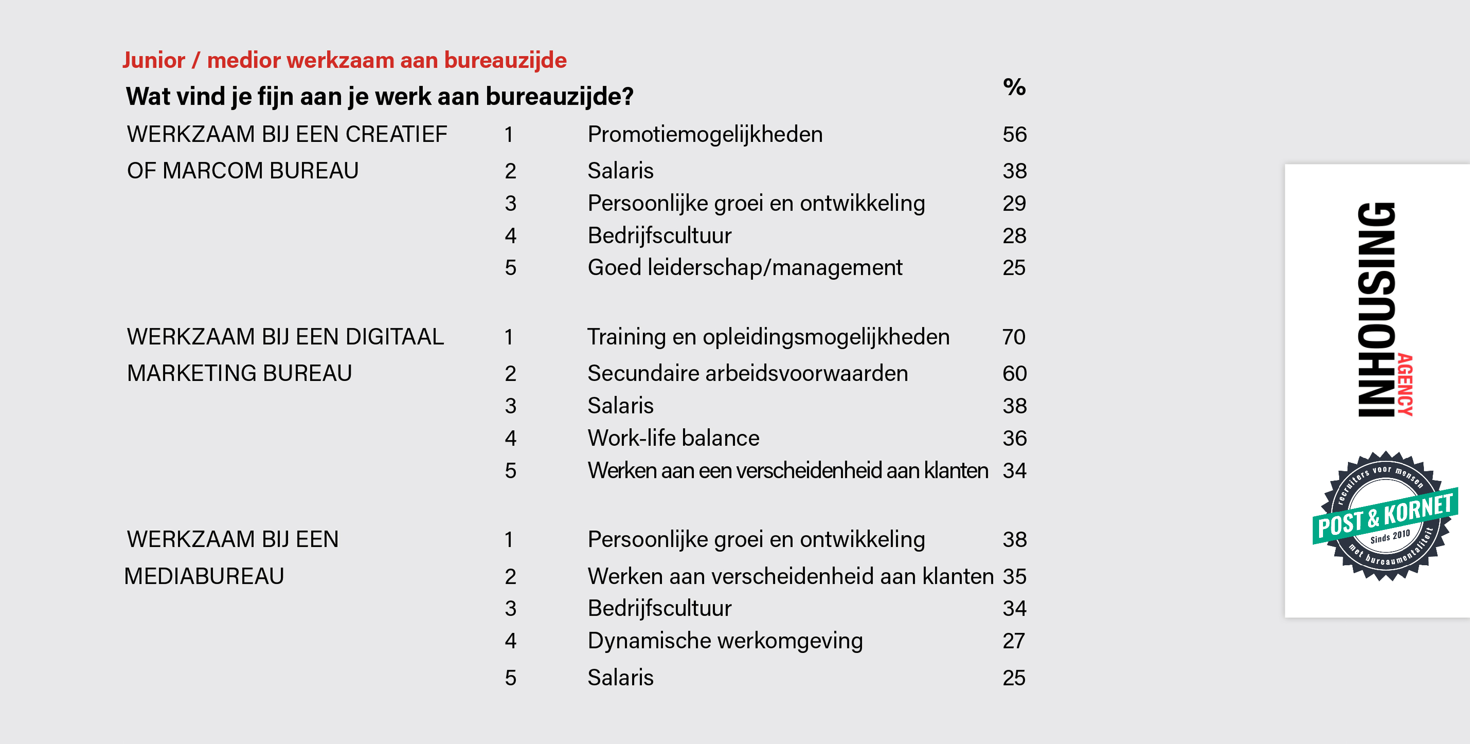 Het werken aan een verscheidenheid aan klanten wordt door de junior/medior groep beschouwd als fijn bij zowel mediabureau als digitaal bureau. Promotiemogelijkheden (en daarmee en hogere functie en dito salaris) worden door personen werkzaam bij creatieve bureaus als belangrijkste benoemd. Daarbij gaf ook meer dan de helft van creatieve bureauprofessionals dit als belangrijkste item aan.