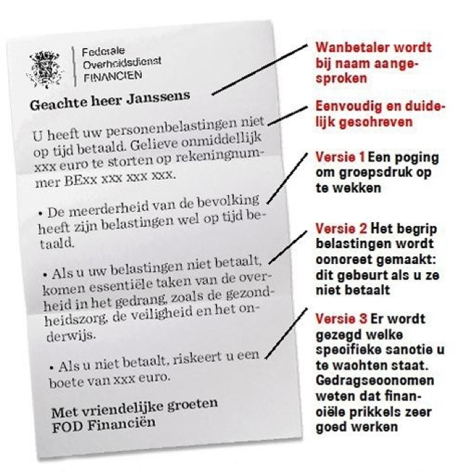 In 2016 viel een bijzondere aanmaningsbrief in de postbus van vergeetachtige belastingbetalers. Op het eerste gezicht niets bijzonders, echter maakte deze brief deel uit van een experiment van de Belgische FOD Financiën.