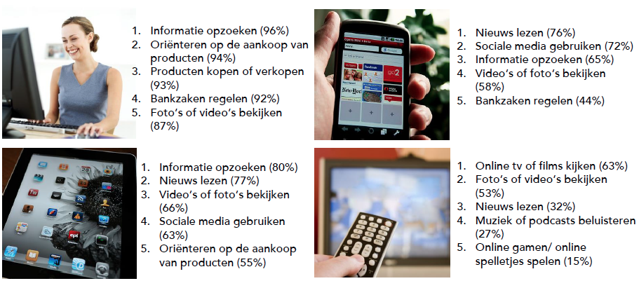Uit het gebruik van devices per online activiteit wordt duidelijk dat de (mobiele) devices voor verschillende doeleinden worden gebruikt. De televisie onderscheidt zich duidelijk van de rest, deze wordt voornamelijk gebruikt waar deze oorspronkelijk voor bedoeld is: het kijken van tv of films (63%). Maar men kijkt nog vaker online tv of films op de pc of laptop (87%) en op de tablet (66%). Verder valt het op dat het gebruik van social media als enige activiteit niet vaker wordt gedaan op de laptop of pc dan met een smartphone. Dit is bij beide 72%.