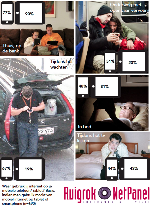 Uit het onderzoek blijkt dat de tablet met name thuis wordt gebruikt. De tablet wordt naast thuis op de bank ook regelmatig gebruikt tijdens het tv kijken (43%). De smartphone wordt, waarschijnlijk vanwege zijn handzamere formaat, veel vaker buiten de deur gebruikt dan de tablet. Ook opvallend: werkende mannen gebruiken hun smartphone vaker op het werk (68%) dan vrouwen (53%).