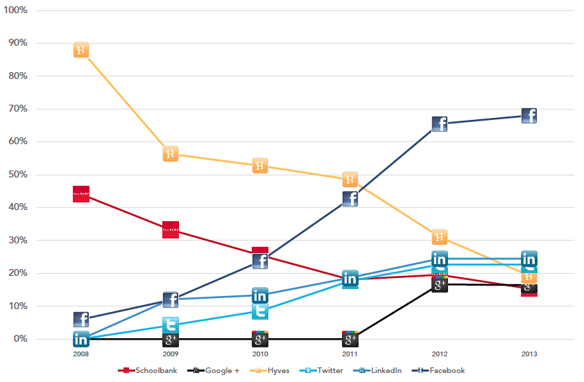 Heeft facebook zijn hoogtepunt bereikt? Als we het gebruik van verschillende sociale netwerken over de afgelopen jaren vergelijken, dan zien we dat het aantal facebookgebruikers in 2013 nagenoeg niet meer toeneemt. Mogelijk neemt het aantal actieve gebruikers en de gebruiksfrequentie van Facebook af. In de cijfers van comScore bijvoorbeeld is te zien dat de afgelopen maanden het maandelijks uniek bezoek lager was dan vorig jaar. Hoewel het aantal gebruikers in Nederland nog niet is afgenomen, geeft een kwart van de respondenten van het onderzoek van Ruigrok aan facebook niet meer zo leuk te vinden als in het begin. Daarnaast geeft één op de vijf aan te merken dat vrienden minder berichten op facebook plaatsen als voorheen.
