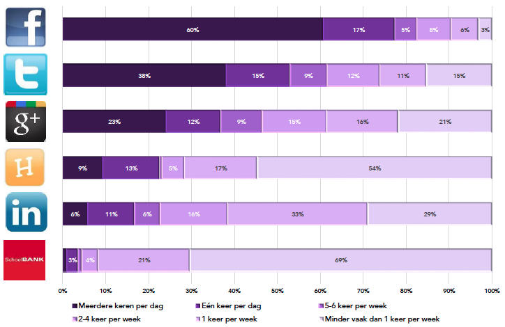 Er zijn van die mensen die voor je gevoel de hele dag ‘op facebook zitten’. Ze zijn altijd online en reageren binnen een minuut als er een bericht geplaatst wordt. Of zij werkelijk gedurende de hele dag op facebook te vinden zijn weten de onderzoekers niet, maar ze leren wel dat zes op de tien gebruikers in ieder geval meerdere keren per dag zijn facebook bekijkt. Verder valt het op dat hyves en schoolbank netwerken zijn waar de meeste gebruikers minder vaak dan eens per week te vinden zijn. Ten slotte gebruiken vrouwen over het algemeen regelmatiger sociale netwerken (61% gebruikt deze regelmatig tot vaak) dan mannen (48%).