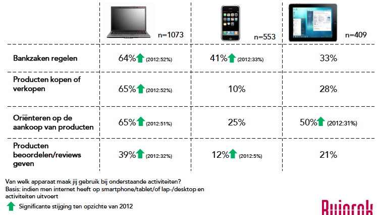 De verschillende activiteiten rondom ecommerce worden steeds vaker uitgevoerd op (mobiele) devices in vergelijking met 2012. Bij alle activiteiten zien we een stijging in het uitvoeren hiervan met een laptop of pc. Daarnaast neemt ook het aantal Nederlanders dat activiteiten op mobiele devices uitvoert toe. We zien dat het regelen van bankzaken en het beoordelen van producten vaker met een mobiele telefoon gebeurt en dat men zich vaker oriënteert op de aankoop van producten met een tablet. Verder geeft 16% van de Nederlanders aan graag zijn smartphone te willen gebruiken voor het doen van aankopen in een fysieke winkel.