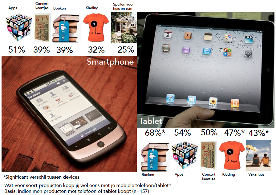 Nederlanders met een tablet waar zij internet op gebruiken, doen hier vaker aankopen mee (28%) dan Nederlanders met mobiel internet op hun smartphone (10%). De helft van de smartphonegebruikers die wel eens online aankopen doet koopt wel eens apps. Met de tablet koopt men het vaakst boeken (68%). Opvallend is dat tabletgebruikers dit jaar minder vaak apps kopen (54%) dan in 2012 (73%).