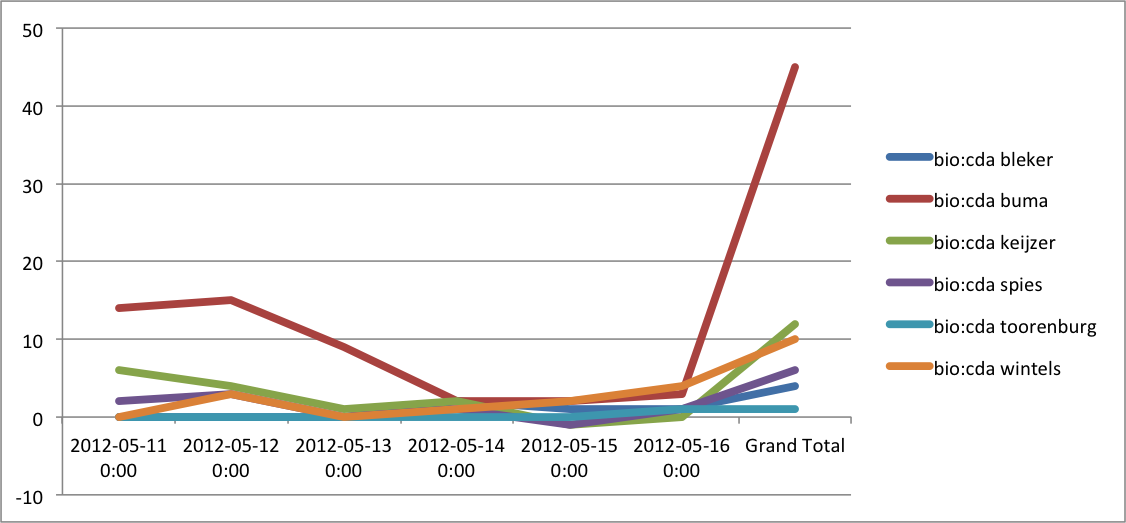 In totaal hebben de twitteraars die CDA in hun bio hebben staan 437 tweets losgelaten. Dit is natuurlijk een beperkt aantal om statistiek op los te laten. Wel is opvallend dat Sybrand Van Haersma Buma met 45 positieve tweets ver op kop staat, gevolgd door Mona Keijzer met 12 (in totaal 78 positieve tweets).