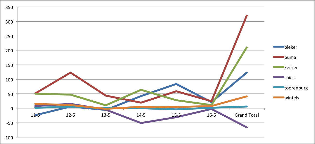 Qua sentiment staat Sybrand van Haersma Buma ver bovenaan met een sentiment score van 320, gevold door Mona Keijzer met 210 en Henk Bleker met een score van 123. De score van Henk Bleker is wel naar boven vertekend omdat ook nu relatief veel ironische berichten over hem worden geplaatst en omdat hij de “positieve” term ‘eerlijk helder Henk’ als slogan heeft gekozen. Geeft hier de spindoctor Jack de Vries zijn visitekaartje af?
