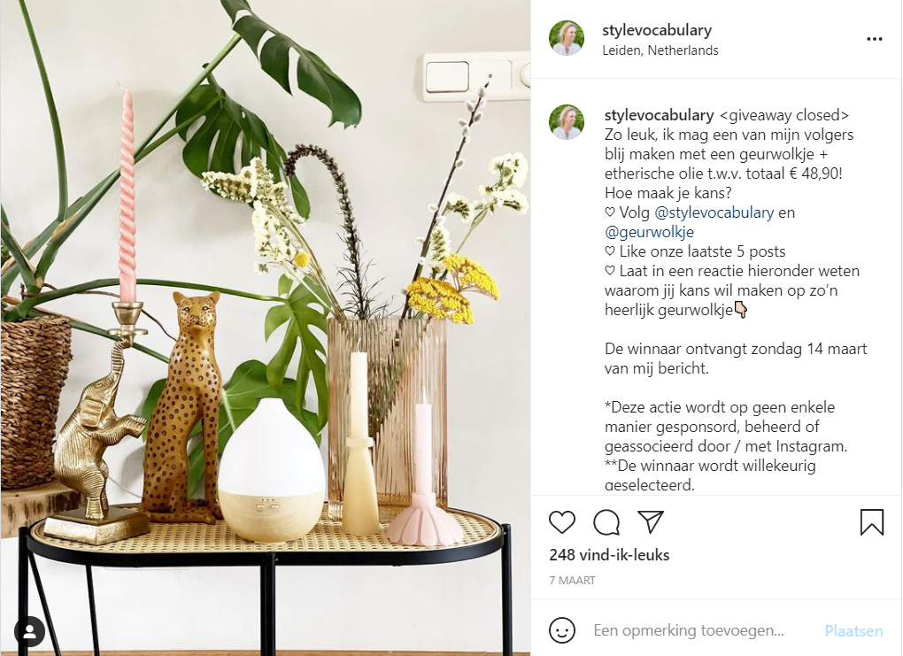 - Het wordt afgeraden om continu dezelfde producten via winacties weg te geven. Probeer je winacties daarom divers te houden. Daarmee blijf je ook je volgers verrassen.