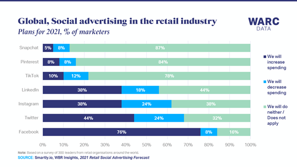 Driekwart van de retailers, 76 procent, zegt dat ze in 2021 meer willen gaan uitgeven aan advertenties op Facebook. De populariteit van adverteren op Facebook geldt in verschillende retailsegmenten en regio’s. Het afgelopen jaar investeerde 93 procent van de retailers in Facebook-advertenties. Op Instagram was dit 90 procent. En Twitter is nog altijd nite dood: 83 procent van de bedrijven kocht in 2020 advertenties in op Twitter.