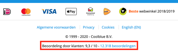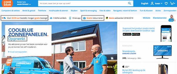 De unique selling points van Coolblue zijn niet meer zo uniek. Grote webshops als Bol.com, Wehkamp en Media Markt bieden dezelfde of vergelijkbare opties. Het onderscheidende vermogen van Coolblue is helemaal onderin op haar homepage te vinden.