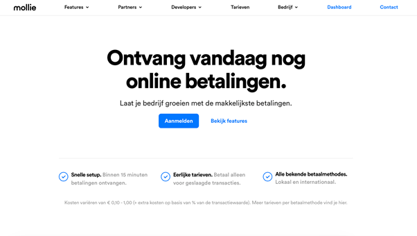 De website van de betaalprovider geeft ons de kern van haar succes: “ontvang vandaag nog online betalingen”. Dat klinkt als de normaalste zaak van de wereld, maar bij reguliere banken ben je dan al snel een paar dagen verder. Daarbij bieden banken vaak alleen iDeal aan. Mollie heeft bovendien lage tarieven. Bij Rabobank betaal je eenmalig 100 euro en vervolgens 30 euro per maand, terwijl Mollie alleen een bedrag per transactie rekent. Tot slot geeft Mollie je direct toegang tot alle bekende betaalmethodes.