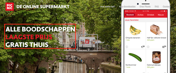 Op de homepage wordt het al direct duidelijk: “Alle boodschappen, laagste prijs, gratis in thuis”. Drie jaar geleden was het nog niet meer dan normaal om te betalen voor de bezorging van je etenswaren. Picnic biedt iets aan wat anderen niet durven of kunnen, namelijk gratis bezorging en de laagste prijs. Het bedrijf heeft geen fysieke winkels en bezorgt de boodschappen in elektrische koekblikjes (pardon, bestelbusjes) gratis bij je thuis.