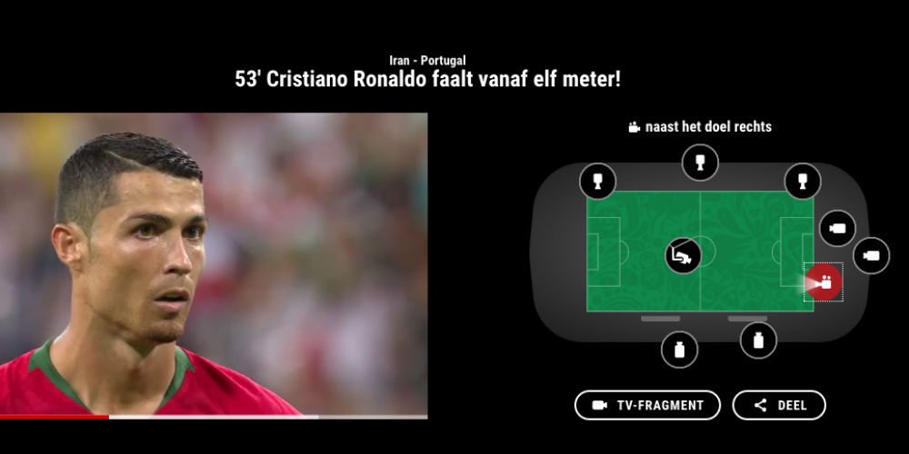 Tot zo ver het perfecte live-beeld. Tegelijk biedt de NOS gelukkig ook de uitgestelde kijker veel extra gemak. De meest in het oog springende feature van de app en website van de nationale sportzender is NOS 360°. Hiermee ben je zelf de regisseur tijdens het WK. Van hoogtepunten uit elke wedstrijd (goals, maar ook pijnlijke missers of schandalige overtredingen) kun je namelijk zelf bepalen vanuit welke hoek je ze wil terugkijken. Zo speel je heel even voor video-scheidsrechter. Dat is trouwens ook een opmerkelijke feature (waarmee de FIFA onbedoeld een nieuwe hoofdrolspeler heeft gecreëerd), maar die techniek valt buiten de macht van de NOS.